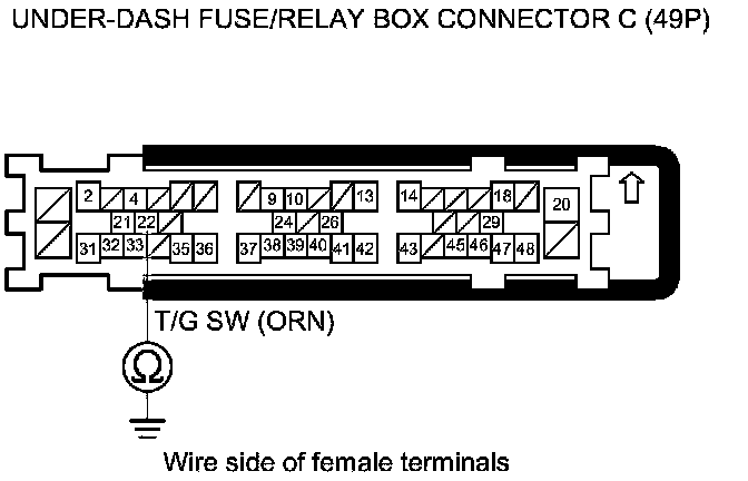 7. Check for continuity between under-dash fuse/relay box connector C (49P) terminal No. 22 and body ground.