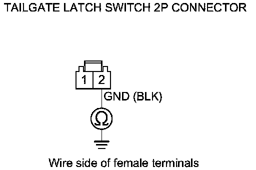 11. Check for continuity between tailgate latch switch 2P connector terminal No. 2 and body ground.