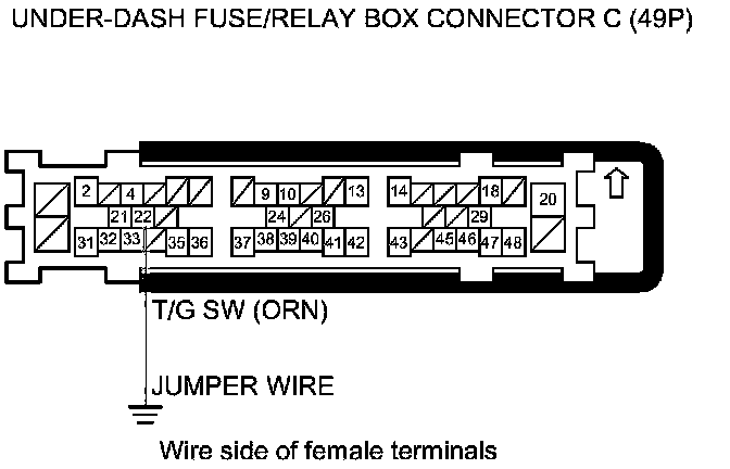12. Connect under-dash fuse/relay box connector C (49P) terminal No. 22 and body ground with a jumper wire.
