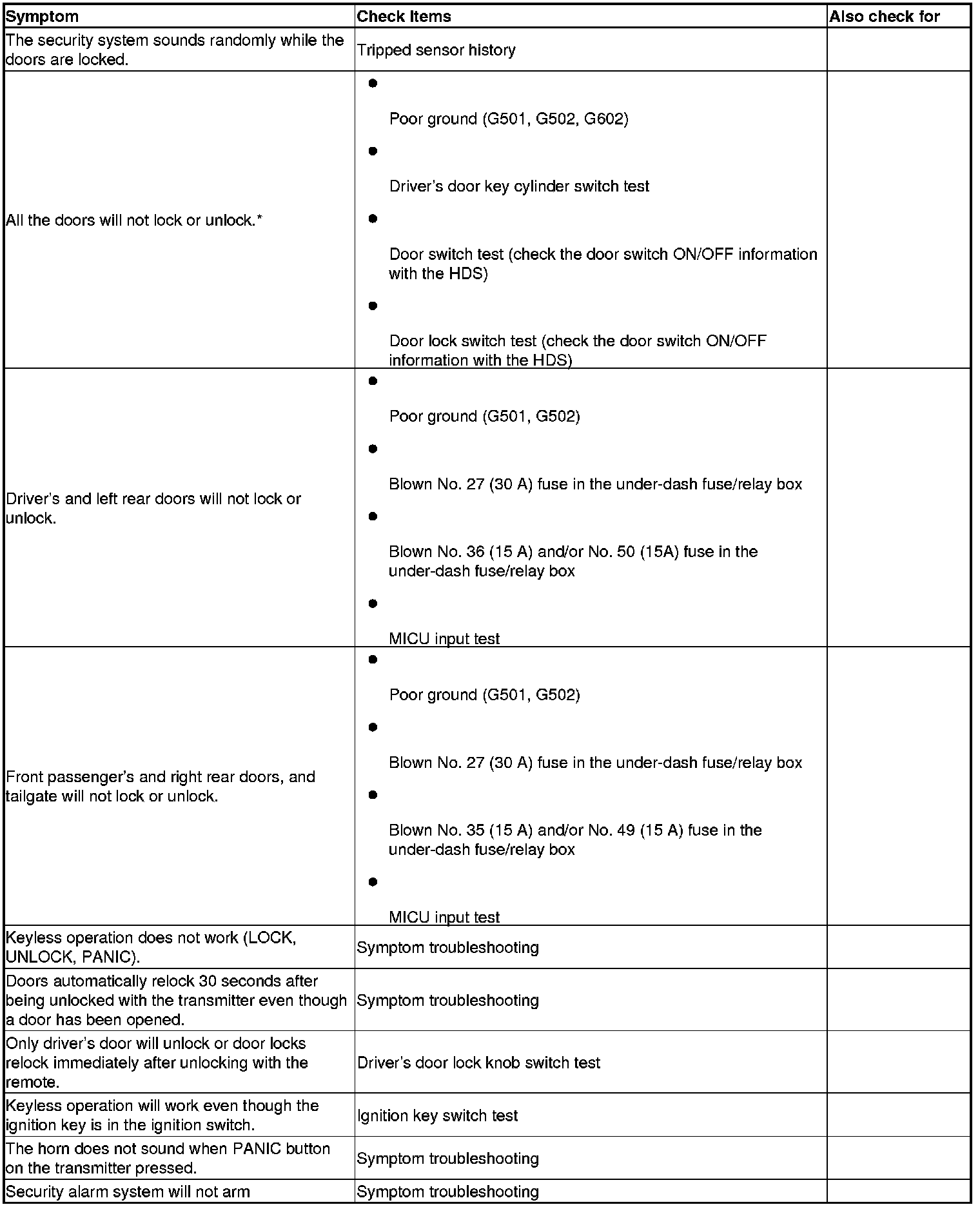 Keyless/Power Door Locks/Security System Symptom Troubleshooting Index