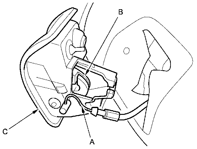 3. Disconnect the control cable (A) from the latch lever (B), and remove the latch cover (C). Take care not to bend the cable.