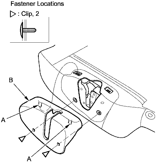 4. Detach the clips and the hooks (A), then remove the striker hole cover (B).