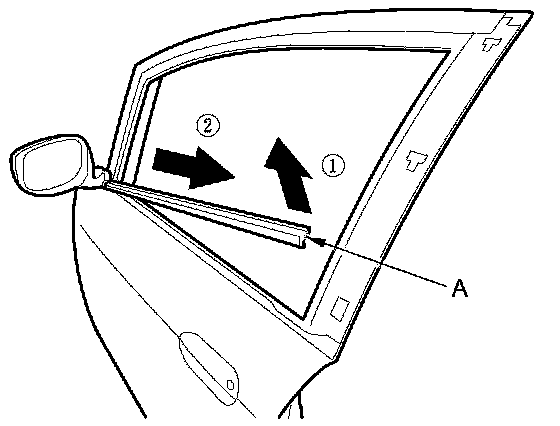 3. While lifting the rear of the door glass outer weatherstrip (A), slide the weatherstrip rearward, then remove the weatherstrip.