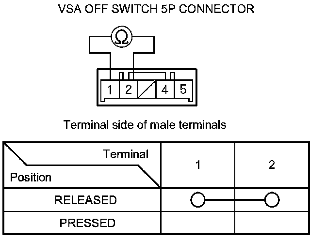 4. Check for continuity between the VSA OFF switch 5P connector terminal in each switch position according to the table.