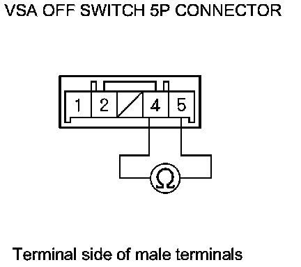 5. Check for continuity between VSA OFF switch 5P connector terminals No. 4 and No. 5. There should be continuity at all times.