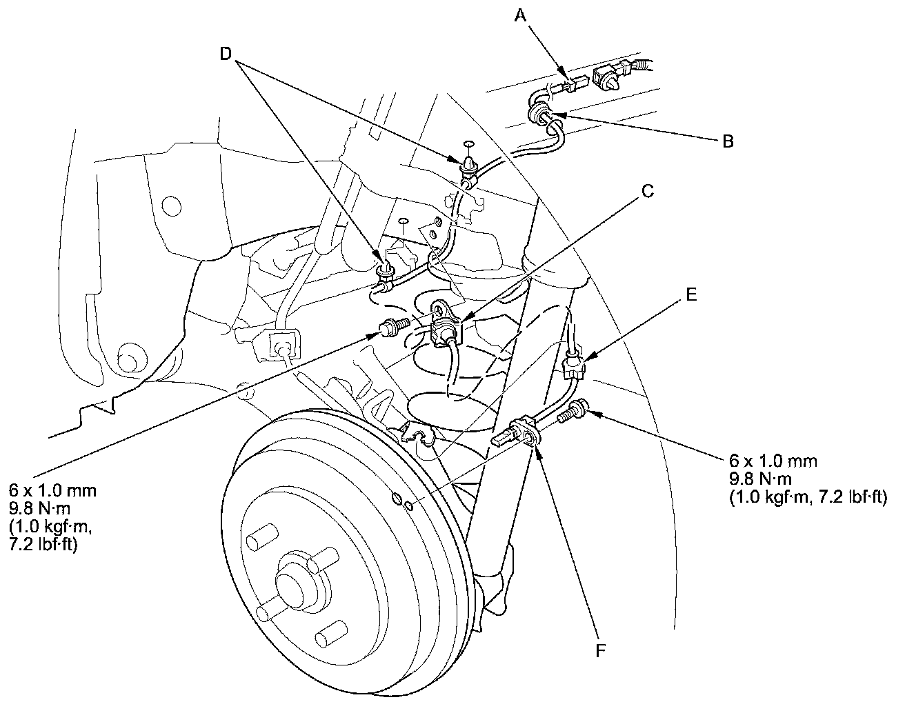 2. Pull back the carpet under the rear seat, then disconnect the wheel speed sensor connector (A).