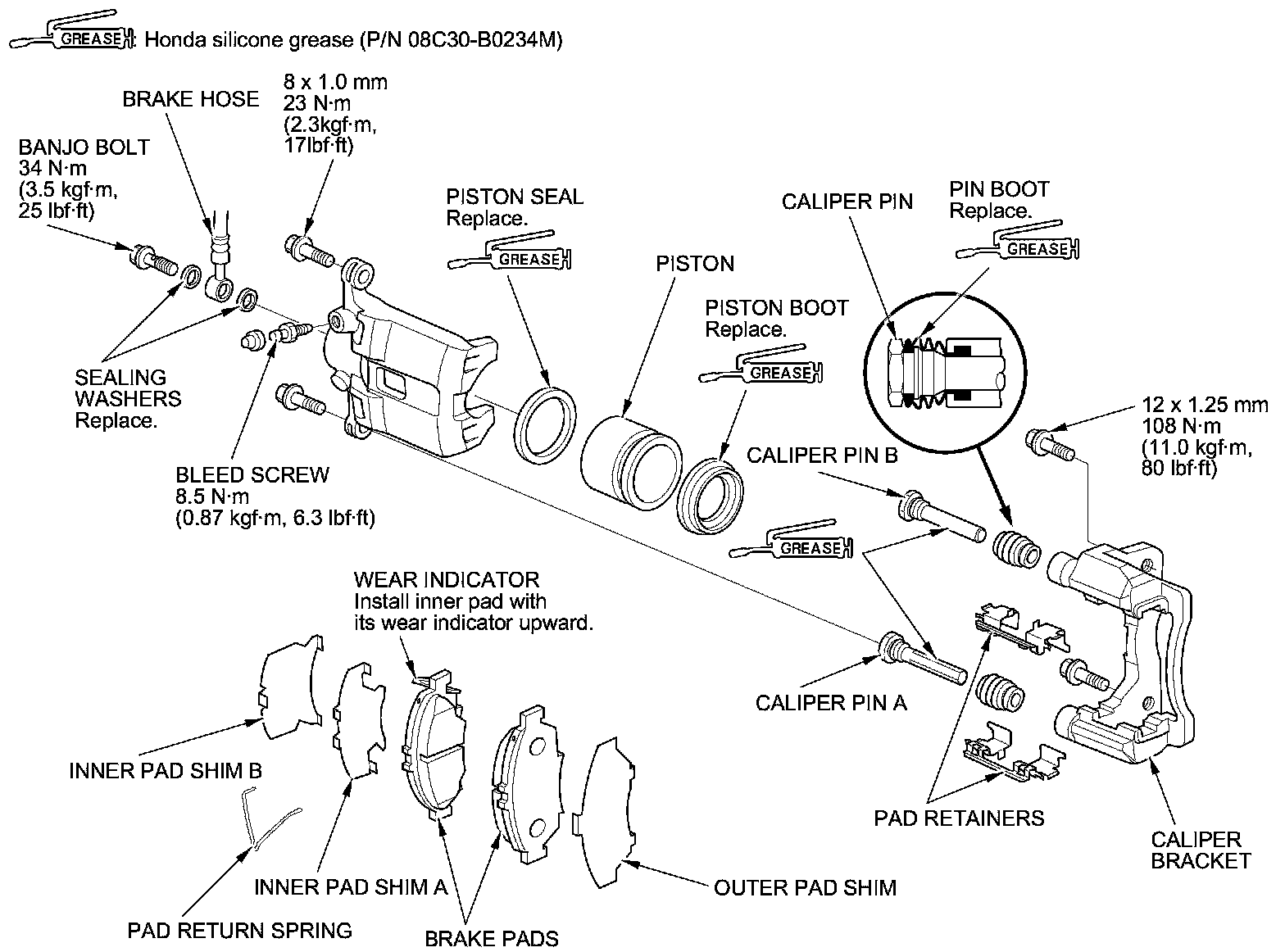Remove, disassemble, inspect, reassemble, and install the caliper, and note these items:
