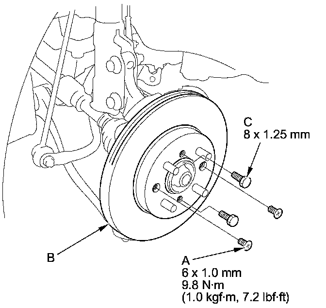 NOTE: If the brake disc is stuck to the front hub, thread two 8 x 1.25 mm bolts (C) into the brake disc to push it away from the front hub. Turn each bolt 90 degrees at a time to prevent the brake disc from binding.