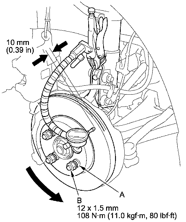 5. Install suitable flat washers (A) and the wheel nuts (B), and tighten the wheel nuts to the specified torque to hold the brake disc securely against the hub.