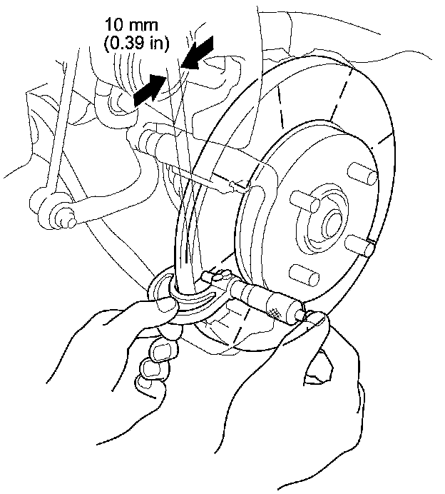 6. Set up the dial gauge against the brake disc as shown, and measure the runout at 10 mm (0.39 in) from the outer edge of the brake disc.