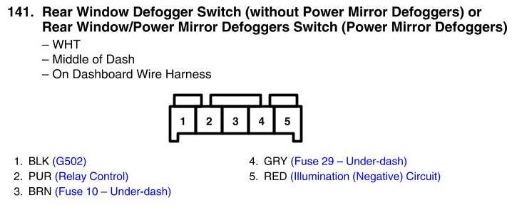 Rear Window Defogger Switch (without Power Mirror Defoggers) or Rear Window/Power Mirror Defoggers Switch (Power Mirror Defoggers) Connector View