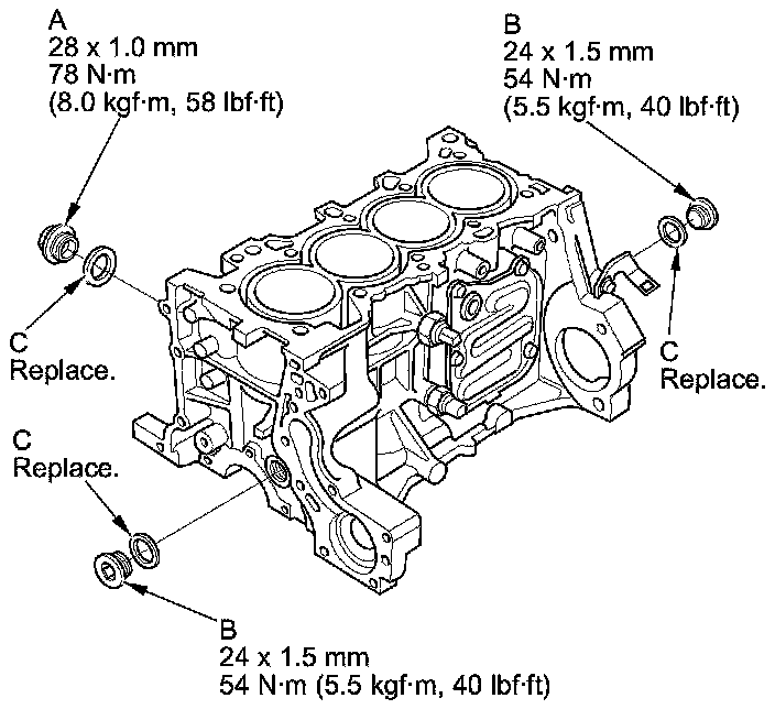 NOTE: When installing the drain bolt (A) and/or the sealing bolt (B), always use a new washer (C).
