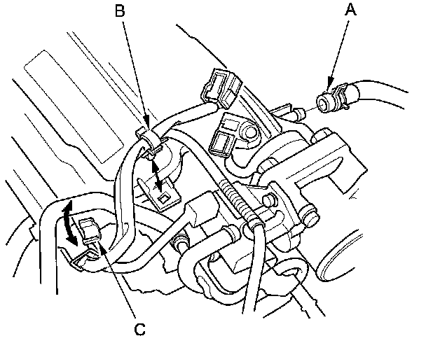 9. Install the brake booster vacuum hose (B) and the harness clamp (C).