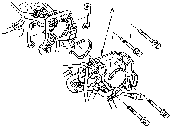 6. Remove the throttle body (A) without disconnecting the water bypass hoses.