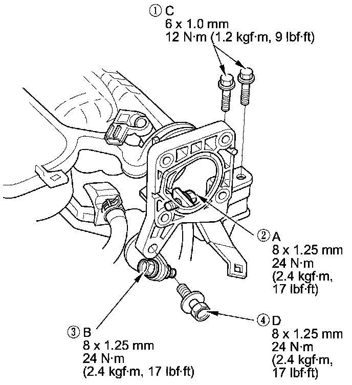 3. Loosen the intake manifold mounting bracket bolts (A, B), then loosely install the intake manifold mounting bracket bolts (C, D).