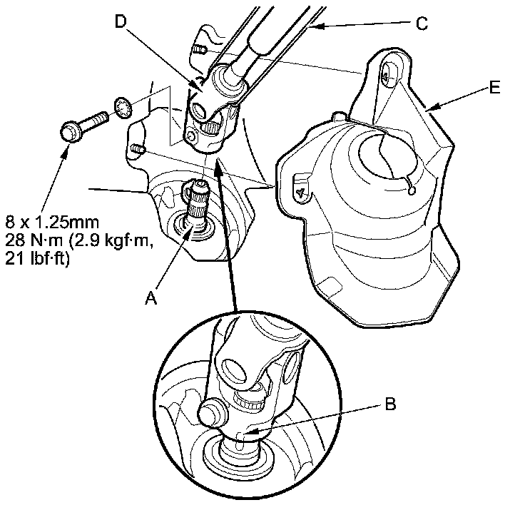 51. Connect the steering joint to the steering gearbox pinion shaft (A) by aligning the reference mark (B), then remove the wire (C) from the joint yoke (D).