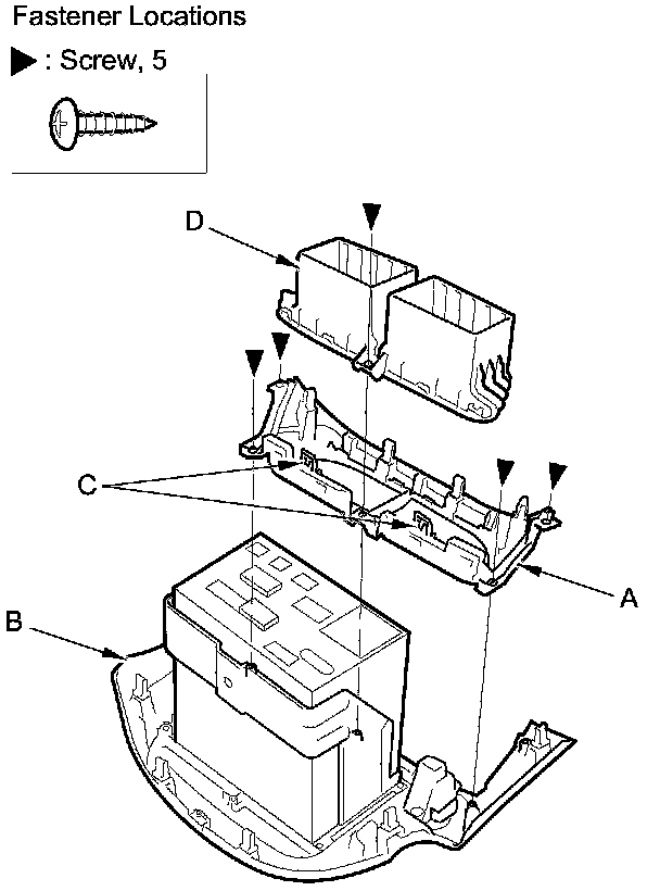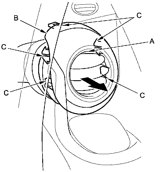 3. Release the hooks (C), then remove the center vent (D) from the center vent panel.