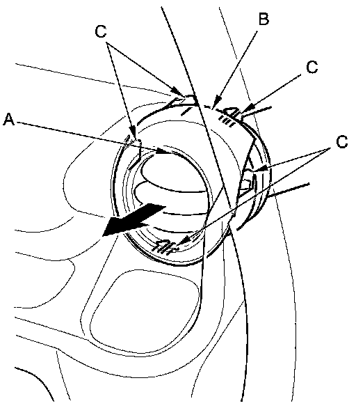 1. Pull the upper portion (A) of the side vent (B) toward you to release the hooks (C), then remove the side vent.