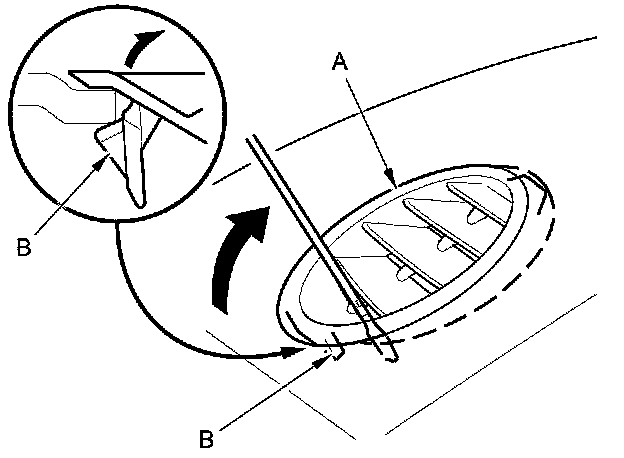 1. Insert the appropriate trim tool into the gap underneath the lowest fin on the side defogger vent trim (A), and pull the vent trim up to release the hook (B).