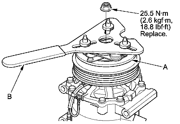 1. Remove the center nut while holding the armature plate (A) with the A/C clutch holder (B).