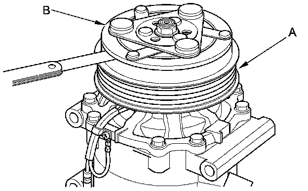 3. Measure the clearance between the rotor pulley (A) and the armature plate (B) all the way around. If the clearance is not within specified limits, remove the armature plate Service and Repair and add or remove shims as needed to increase or decrease clearance.