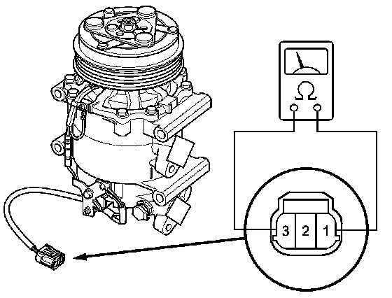 4. Check for continuity between A/C compressor clutch connector terminals No. 1 and No. 3. If there is no continuity, replace the thermal protector A/C Compressor Thermal Protector Replacement.