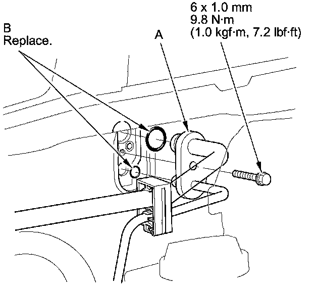 4. Remove the bolt, then disconnect the A/C line (A) from the evaporator core and remove the O-rings (B).