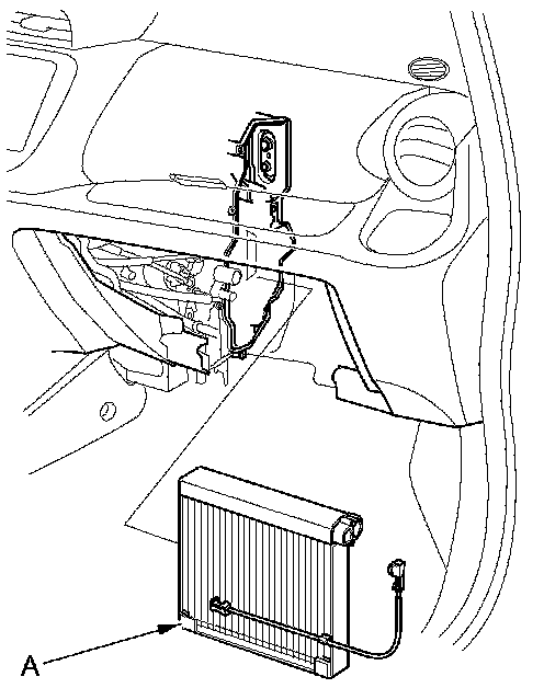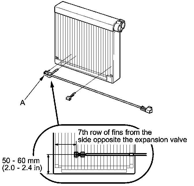 9. Reinstall the evaporator temperature sensor (A). If the evaporator is new, install the sensor on the 6th row of fins, counting from the side opposite the expansion valve. If you are reinstalling the old evaporator, install the sensor on the 7th row of fins.