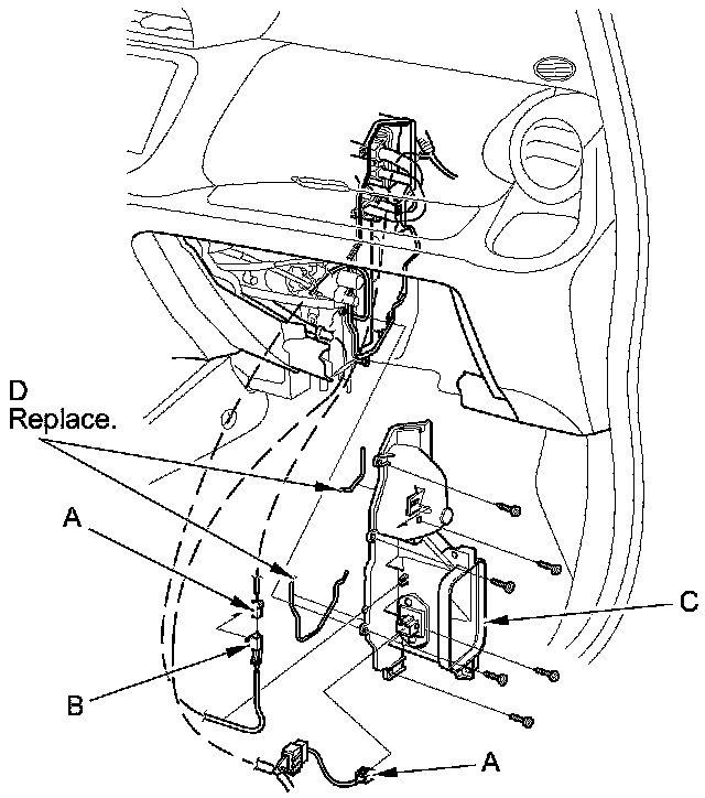 5. Disconnect the connectors (A) from the evaporator temperature sensor and the blower resistor, then remove the connector clip (B). Remove the self-tapping screws, the expansion valve cover (C), and the seals (D).