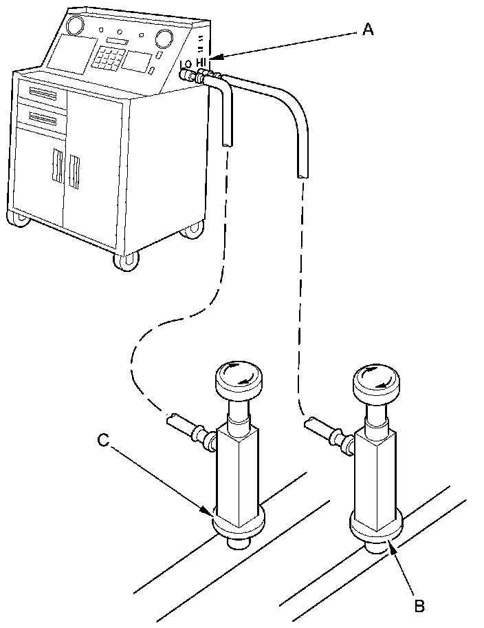 2. Connect an R-134a refrigerant recovery/recycling/charging station (A) to the high-pressure service port (B) and the low-pressure service port (C), as shown, following the equipment manufacturer's instructions. Recover the refrigerant, if any, from the A/C system A/C Refrigerant Recovery.