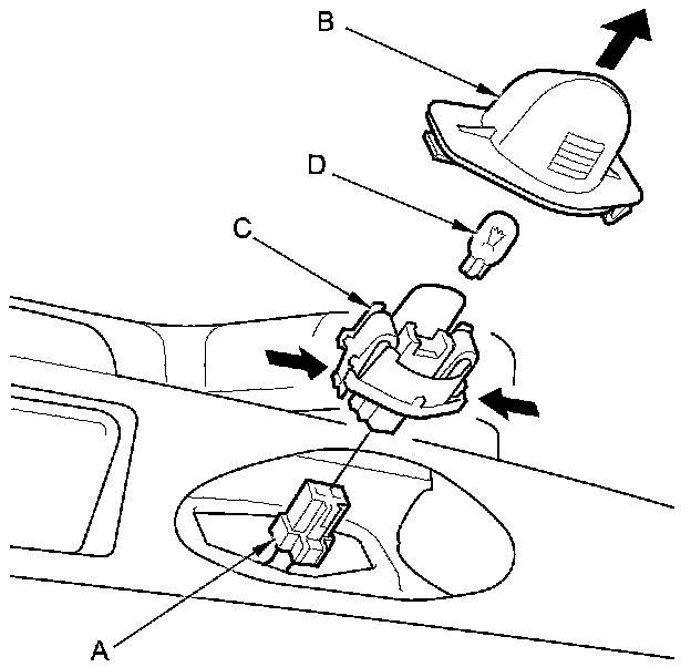 3. Separate the license plate light lens (B) and the housing (C), then remove the bulb (D).