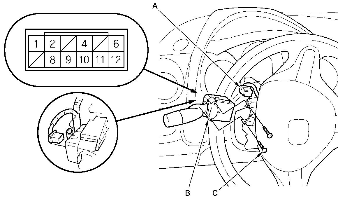 3. Turn the steering wheel to access the combination light switch screws (C).