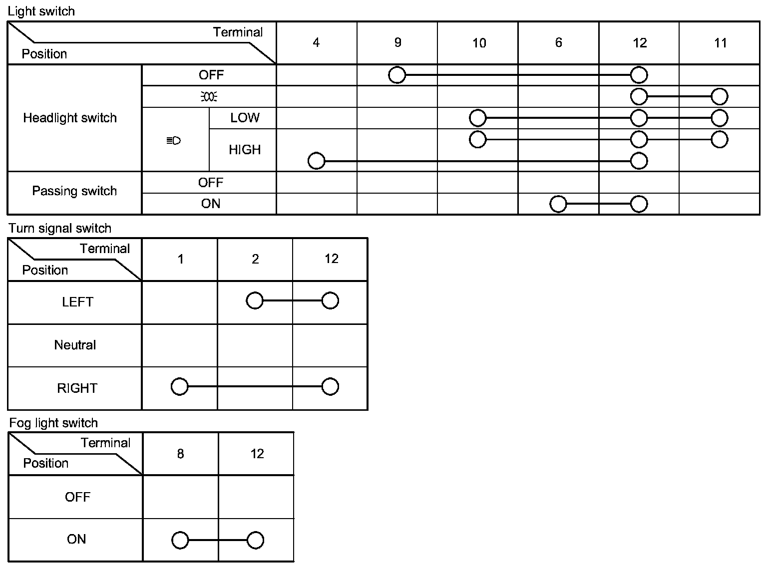 - If the terminals look OK, check for continuity between the terminals in each switch position according to the tables.