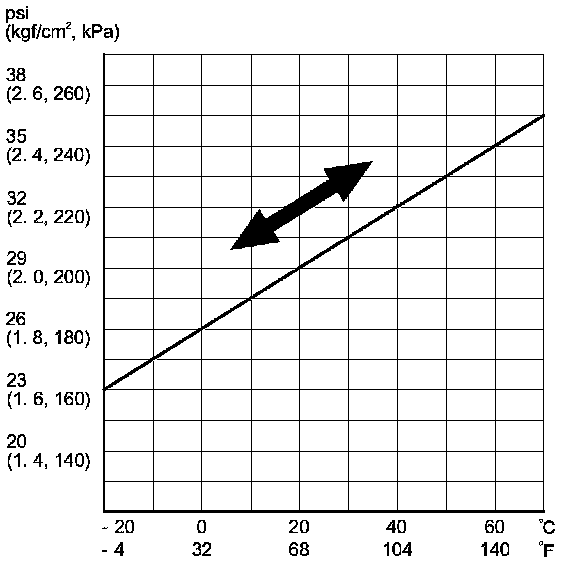 A temperature change of about 18 °F (10 °C) changes tire pressure by about 10 kPa (0.1 kgf/cm2, 1.5 psi). If the temperature drops, tire pressure could decrease enough to turn on the low tire pressure indicator, but later, the tire temperature could increase enough to turn the indicator off. To resolve a complaint of such intermittent indications, confirm and clear the stored DTC(s) and check the tire pressures. Then explain to the customer how temperature changes can affect the system.
