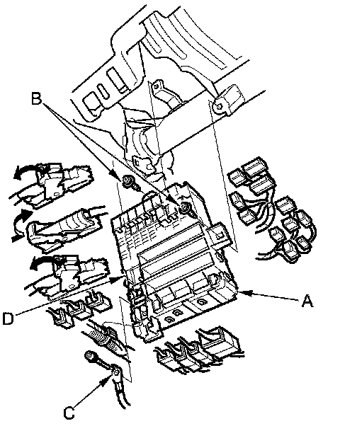 6. Release the lock (D) and pull the fuse/relay box away from the body.