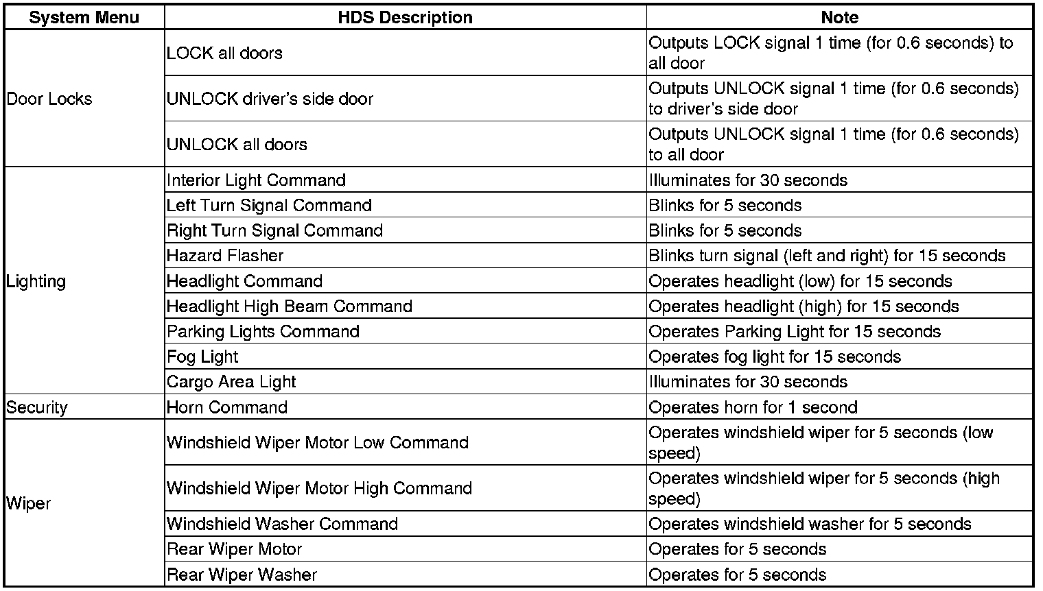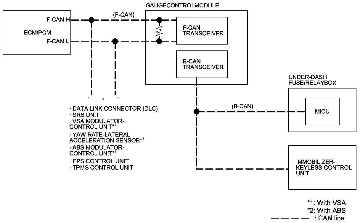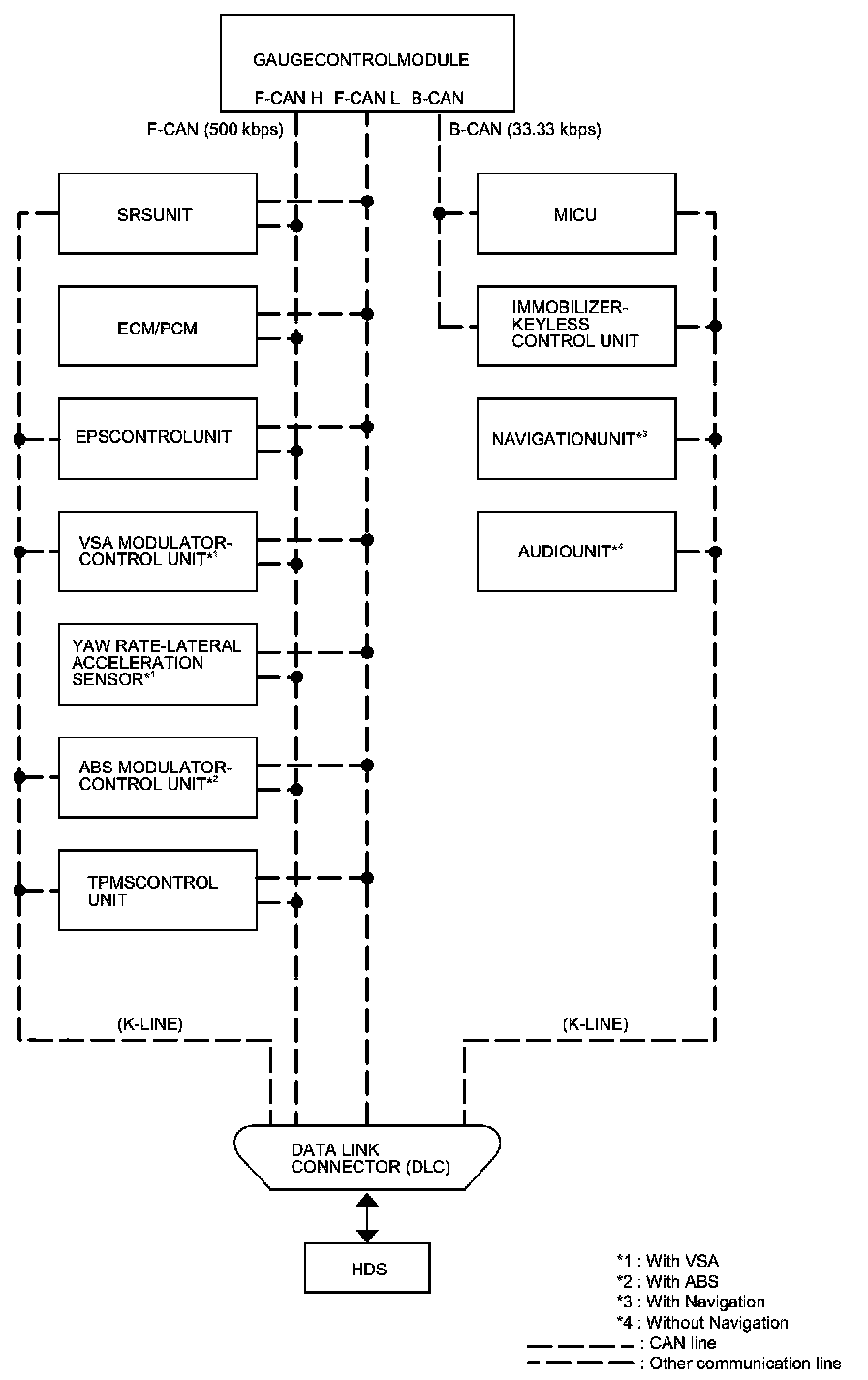 By connecting the HDS to the data link connector (DLC), the HDS can retrieve the diagnostic information from the MICU via a diagnostic line called K-LINE. The K-LINE is a separated from the CAN lines, and is connected to the CAN related ECUs. The MICU is a gateway between the HDS and B-CAN related ECUs, and it sends B-CAN diagnostic information to the HDS. When doing a function test with the HDS, the HDS sends an output signal through the K-LINE to the MICU. The MICU either relays the request to another ECU or commands the function itself.