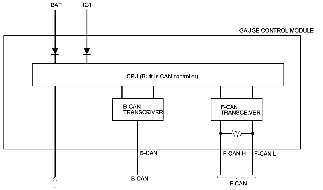 The body controller area network (B-CAN) and the fast controller area network (F-CAN) share information between multiple electronic control units (ECUs). B-CAN communication moves at a slower speed (33.33 kbps) for convenience related items and for other functions. F-CAN information moves at a faster speed (500 kbps) for "real time" functions such as fuel and emissions data. To allow both systems to share information, the gauge control module translates information from B-CAN to F-CAN and from F-CAN to B-CAN.