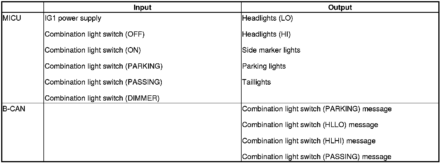 The MICU control of the headlights as daytime running lights based on input from each switch and B-CAN data.