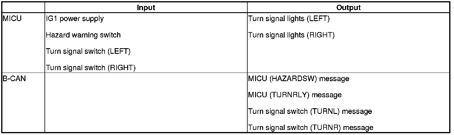 The MICU control of the turn signal/hazard warning lights is based on input from the turn signal switch and the hazard warning switch.