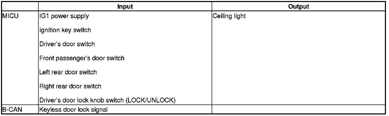 The MICU control of the interior lights is based on input signals of each switches and B-CAN.