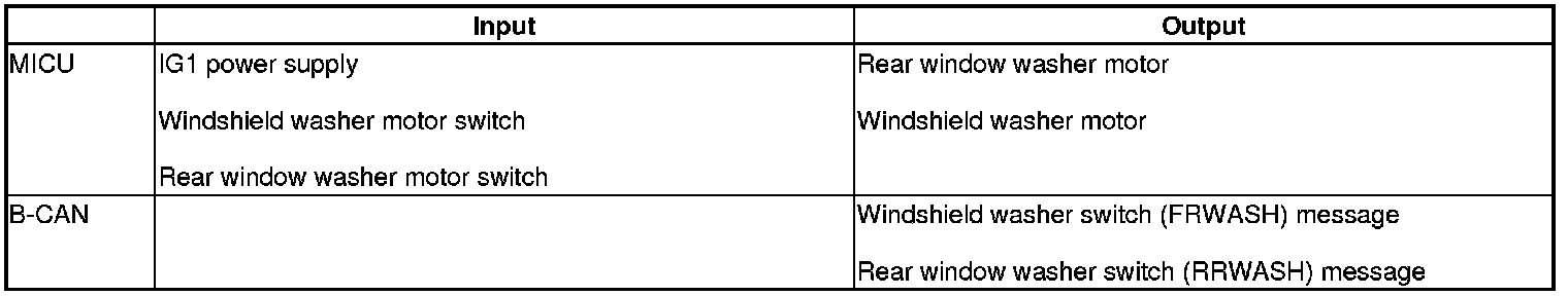 The MICU control of the windshield wiper motor and windshield washer motor is based on input signals from each switch and B-CAN signals.