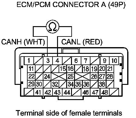 25. Measure the resistance between ECM/PCM connector terminals A3 and A4.