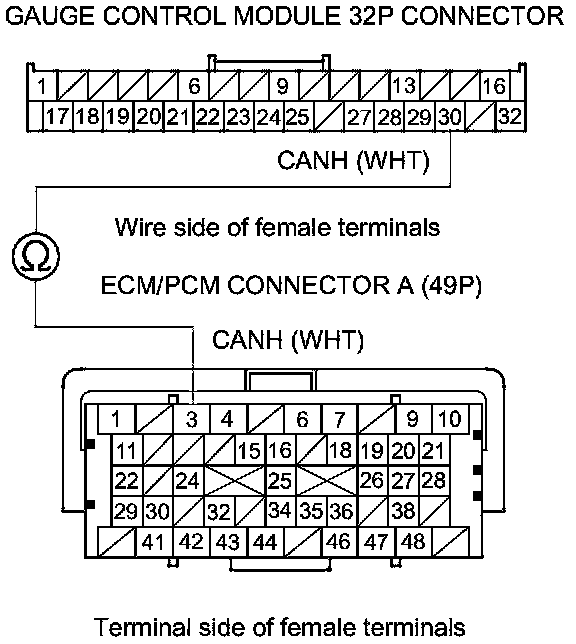 7. Check for continuity between ECM/PCM connector terminal A3 and gauge control module 32P connector terminal No. 30.