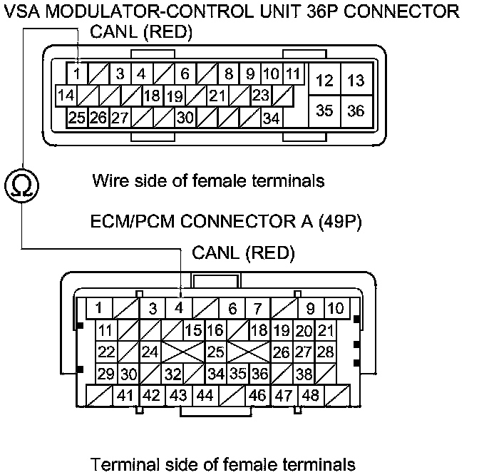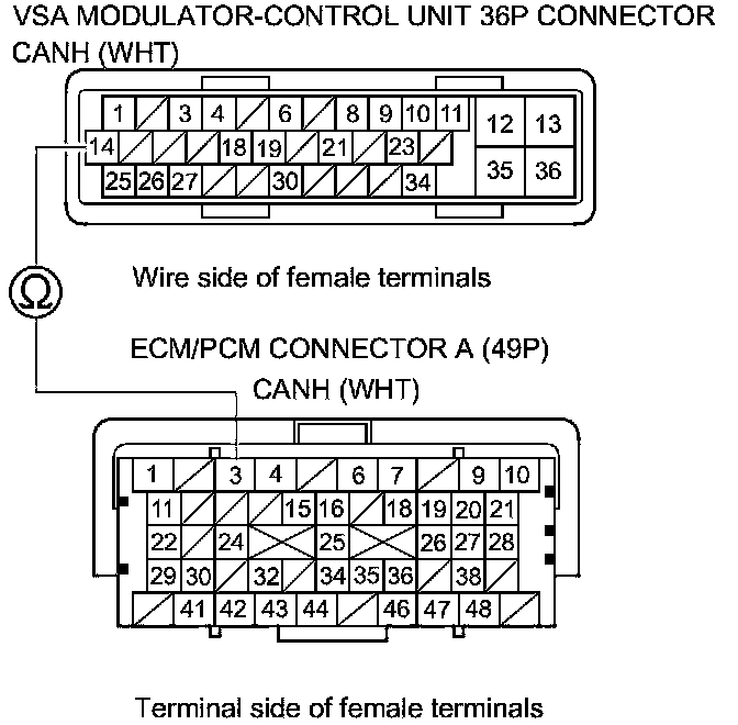 8. Check for continuity between ECM/PCM connector terminal A3 and VSA modulator-control unit 36P connector terminal No. 14.