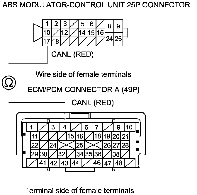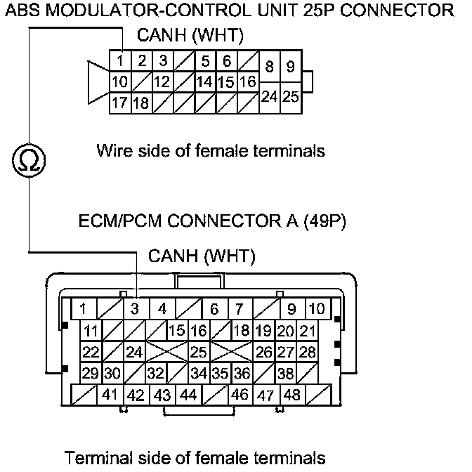 13. Check for continuity between ECM/PCM connector terminal A4 and ABS modulator-control unit 25P connector terminal No. 17.