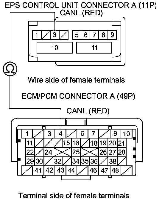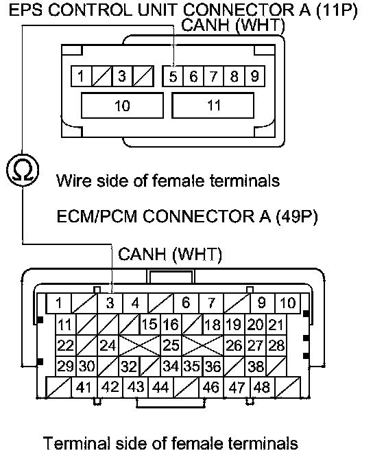 10. Check for continuity between ECM/PCM connector terminal A3 and EPS control unit connector A (11P) terminal No. 5.