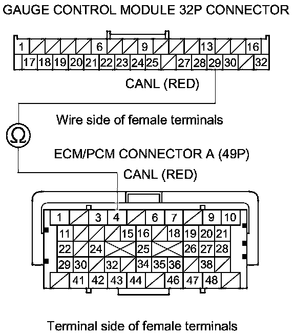 11. Check for continuity between ECM/PCM connector terminal A4 and gauge control module 32P connector terminal No. 29.