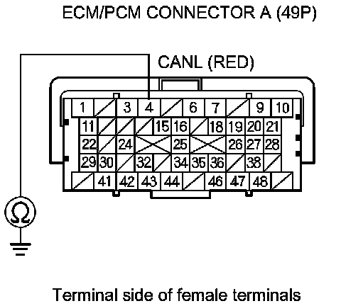19. Measure the resistance between ECM/PCM connector terminals A3 and A4.