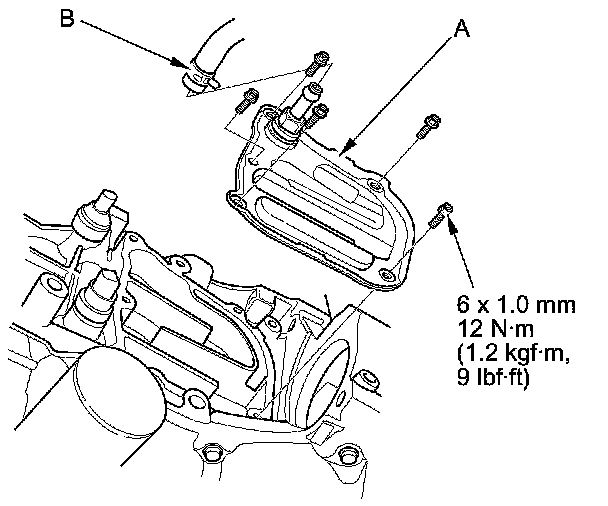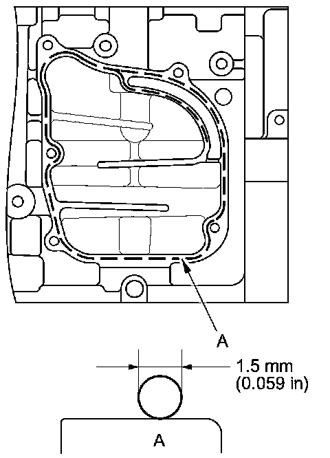 - Apply a 1.5 mm (0.059 in) diameter bread of liquid gasket along the broken line (A).