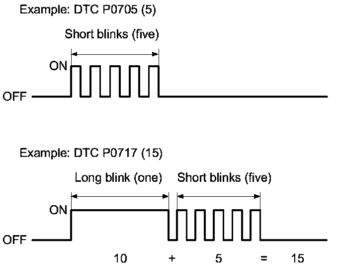 3. Select SCS mode, then observe the D indicator in the gauge control module. Codes 1 through 9 are indicated by individual short blinks. Code 10 and above are indicated by a series of long and short blinks. One long blink equals 10 short blinks. Add the long and short blinks together to determine the code.